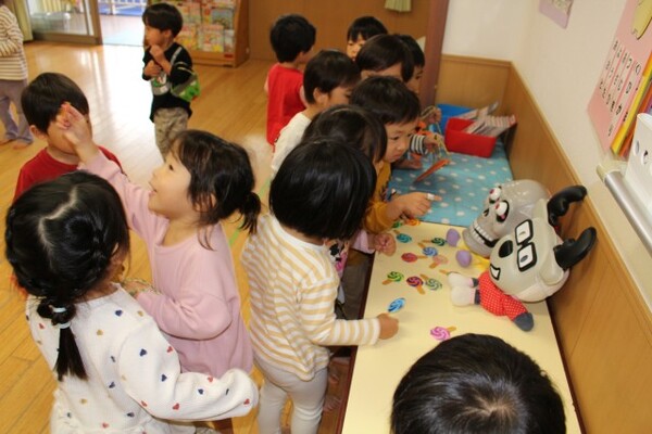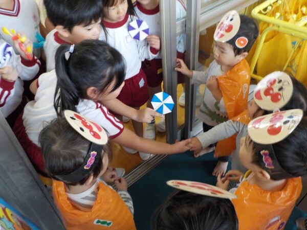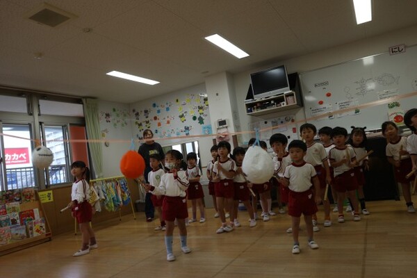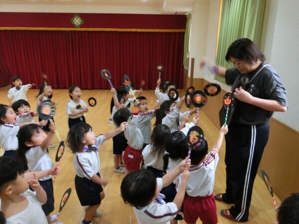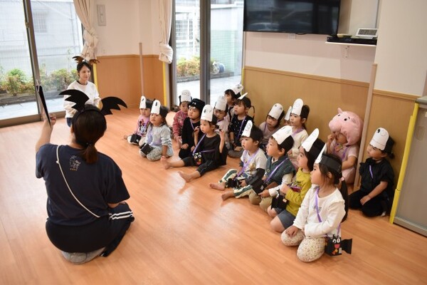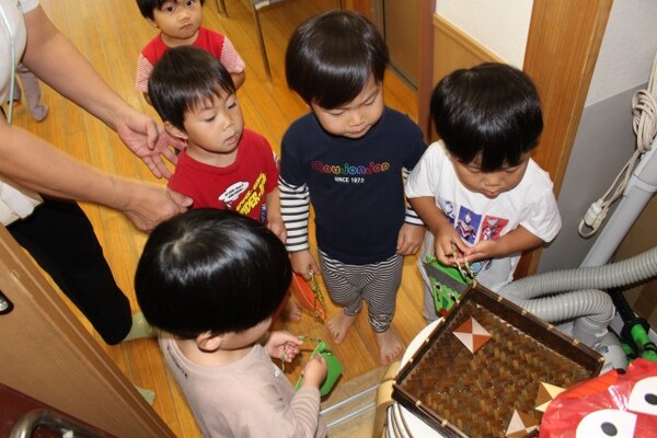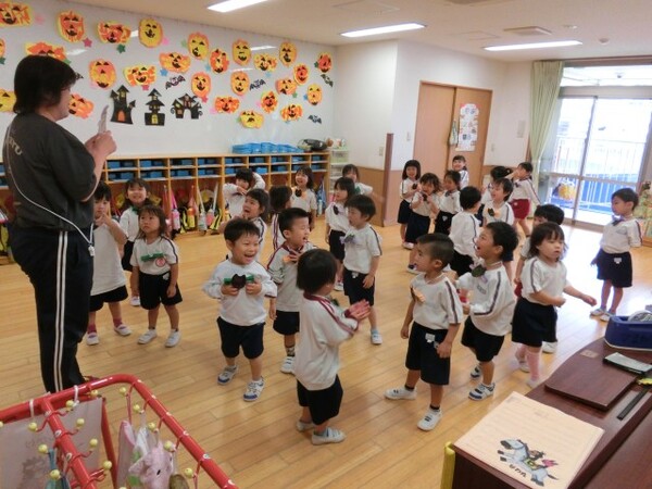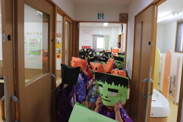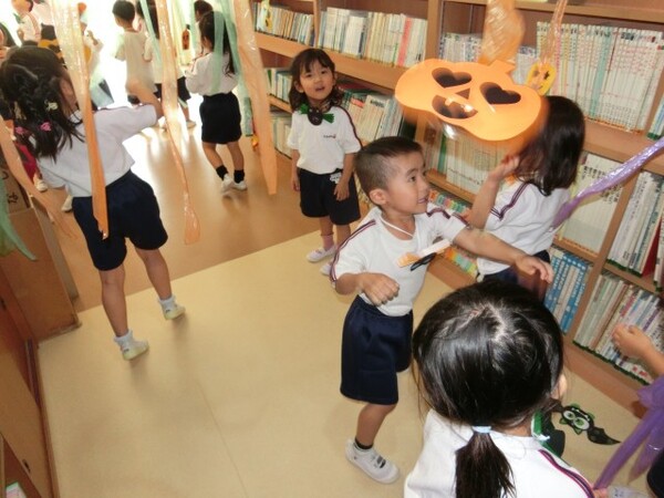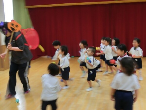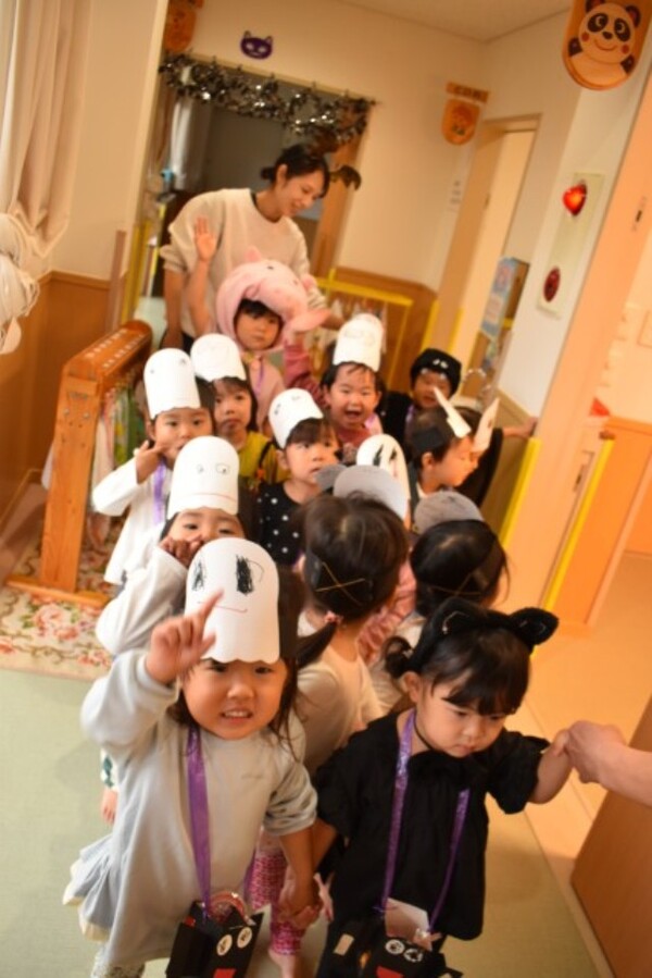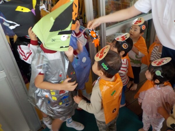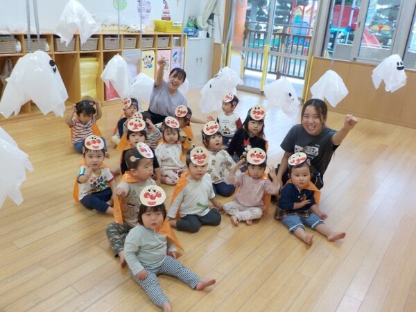 | 本園の1歳児さくら組の様子をお伝えさせていただきます。 今日は、アンパンマンに仮装して、ハロウィンを満喫しました。アンパンマンに変身し、「おばけ退治する!」と張り切ってくれている様子! 園内にいるオバケを探しにいくと、お菓子を持った楽しそうな幼児クラスの雰囲気にワクワクの子どもたち。が、ゆり組の本格仮装に出会うと驚いて泣いてしまう子も・・・気を取り直して、さくら組に帰るといるオバケたちがお部屋をフワフワ!アンパンマンになりきっている子どもたちは、「アンパンチ!」と楽しんでくれていました。  |