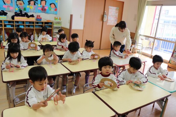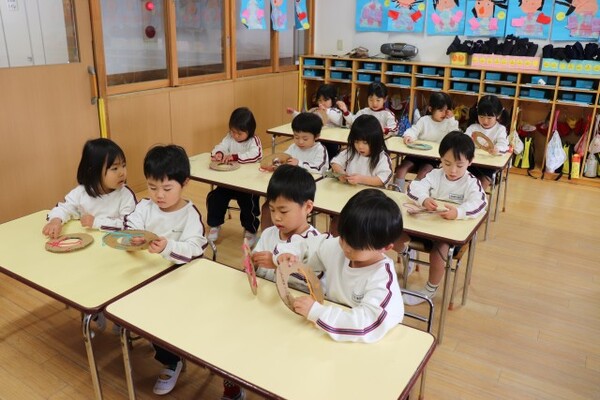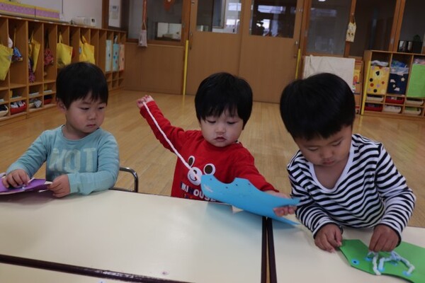 | 本園の3歳児ひまわり組の様子をお伝えさせていただきます。 今日はダンボールに穴をあけたものに毛糸を通して、手づくり楽器を作りました。子どもたちが好きな場所に、ひもを通すのでおもしろい形や模様ができました。出来上がった楽器をお友だちと見せ合いながら、音を奏でていてとても楽しそうでした。 |