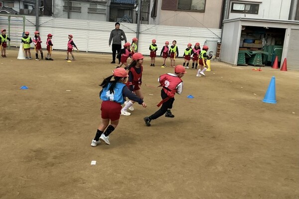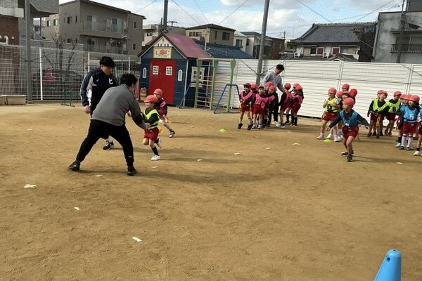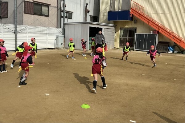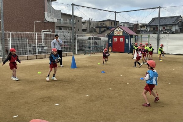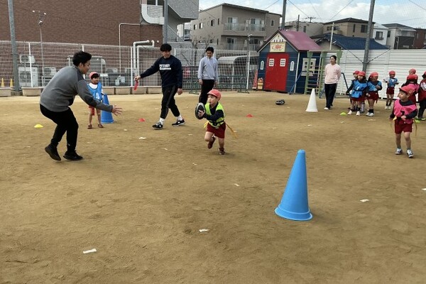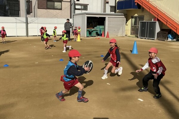 | 本園の5歳児ゆり組の様子をお伝えさせていただきます 今日のタグラグビーは、「3人でコーチからトライを取ろう!」をテーマに、新しいことにチャレンジしました。2対1のドリルでは、キレのあるスピードとステップでトライを量産する子どもたち。自信をもってプレーする姿がたくさん見られました。新しいドリルの3対2では、コーチのディフェンスに苦戦しながらも、仲間とパスをつなぎ見事トライ!状況を見て考え、判断する力がしっかり身についてきています。次回からは、ディフェンス能力やパススキルにも取り組み、さらにレベルアップしていきます!今後の成長が楽しみなコーチ陣です。 |