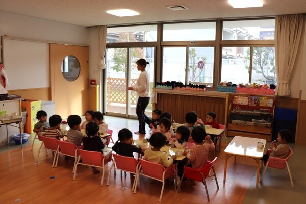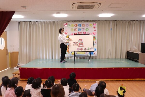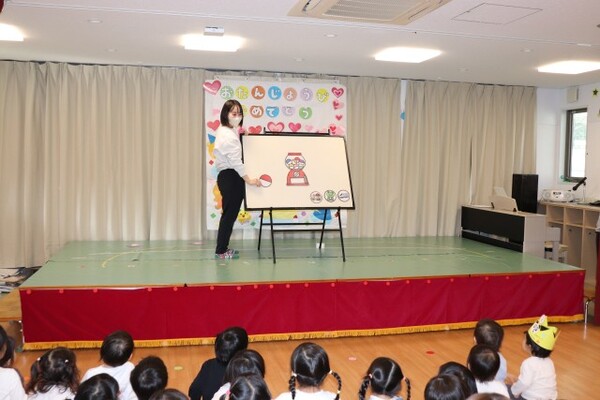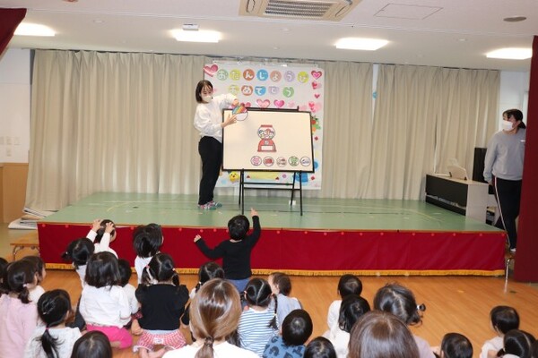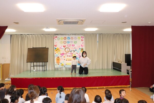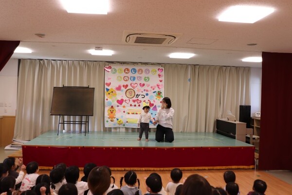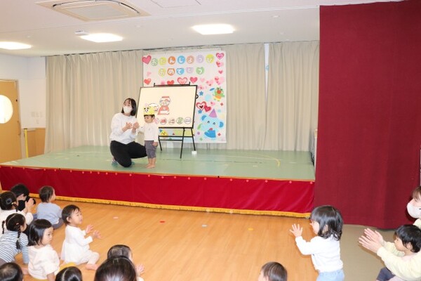 | 分園のお誕生日会の様子をお伝えさせていただきます。 今日は、1月生まれのお誕生日会がありました。1歳児ぱんだ組のお友だち1名がお誕生日を迎え、少し緊張した様子で前に出てきてくれました。 今月は、職員によるパネルシアター「ガチャガチャポン!」を披露してくれました。お金を入れて、「ガチャガチャ♪ガチャガチャ♪」の歌に合わせてハンドルを回すと、ガチャガチャが出てきて、中には消防車やカエル、うさぎなどが入っていました。最後にカラフルなガチャポンを開けてみるとお誕生日ケーキが出てきて、子どもたちも大喜び!最後は、拍手をプレゼントの歌をうたい賑やかなお誕生日会となりました。 お誕生日会の様子は、公式インスタグラムのストーリーズにアップしております。是非ともご覧ください。→公式インスタグラム |