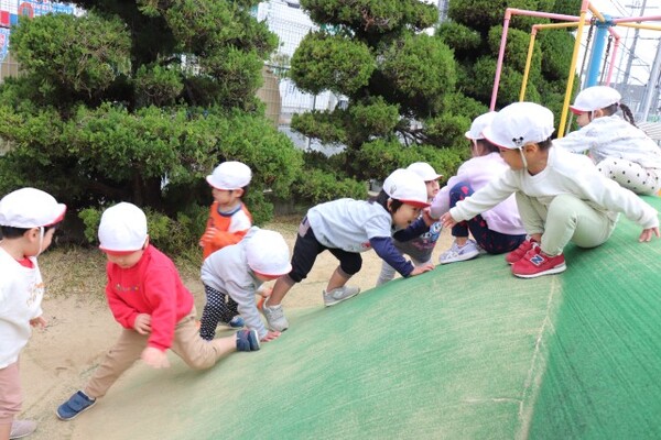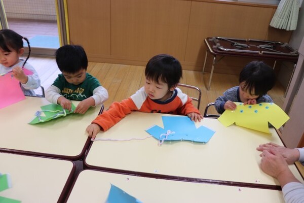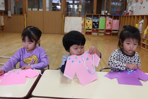 | 本園の2歳児たんぽぽ組の様子をお伝えさせていただきます。 連休明けでしたが、発表会の練習もスムーズだった子どもたち。それが終わってから、今日はひも通し製作を行いました。ひもを穴から引っ張り切れずに「あれ?」となっていた子もいましたが、ひも通し遊びは普段からやっていたでとても上手でした。そのあとは園庭で戸外遊びをしました。助け合いながら土管山を登る姿がとてもかわいかったです。 |