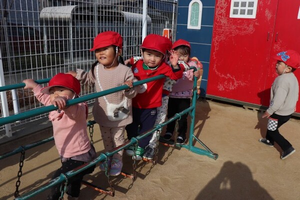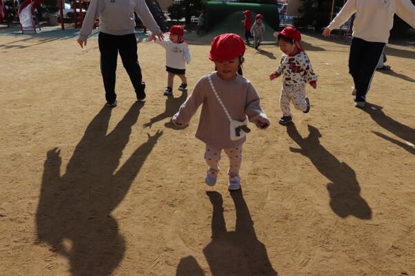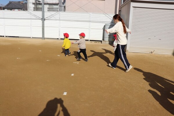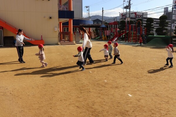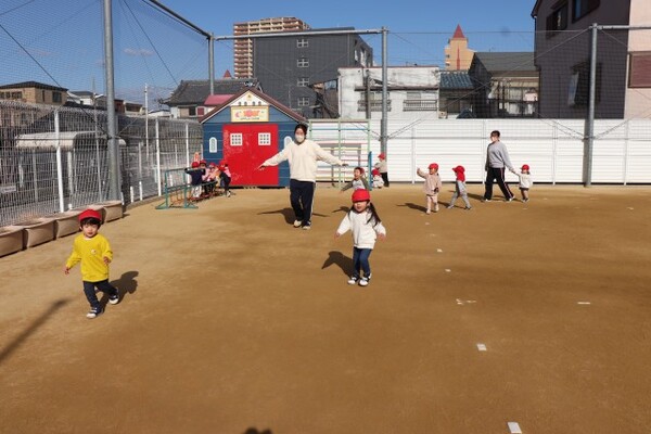 | 本園の1歳児さくら組の様子をお伝えさせていただきます。 発表会の練習が始まり、毎日頑張っている子どもたち。練習を頑張った後、園庭に出て大好きな戸外遊びをしました。担任と「まてまて〜!」と追いかけっこ!遊びを通して、走る力が少しずつ育っています。寒さに負けず、元気よく遊んでいる姿に担任も元気づけられます! |