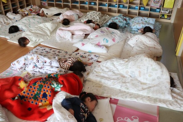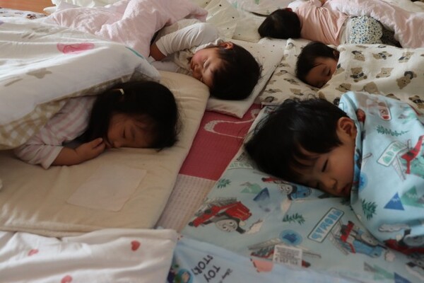 | 分園の1歳児ぱんだ組の様子をお伝えさせていただきます。 お誕生日会の後は戸外でたくさん遊び、お昼寝はぐっすりのぱんだ組のみんな。毎日元気いっぱいの子どもたちも、お昼寝の時間はすぐに夢の中です!お昼寝の後のおやつも、たくさん食べましたよ。 |