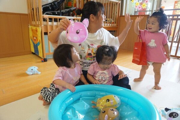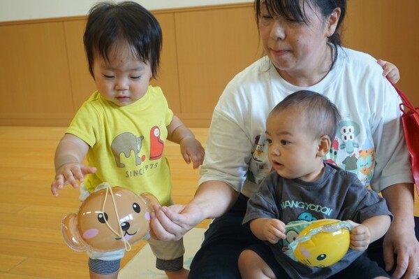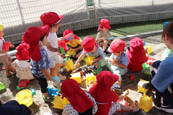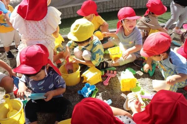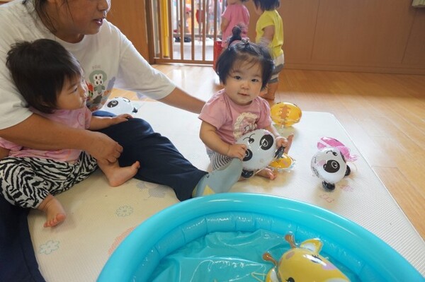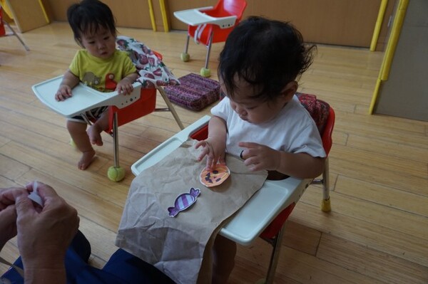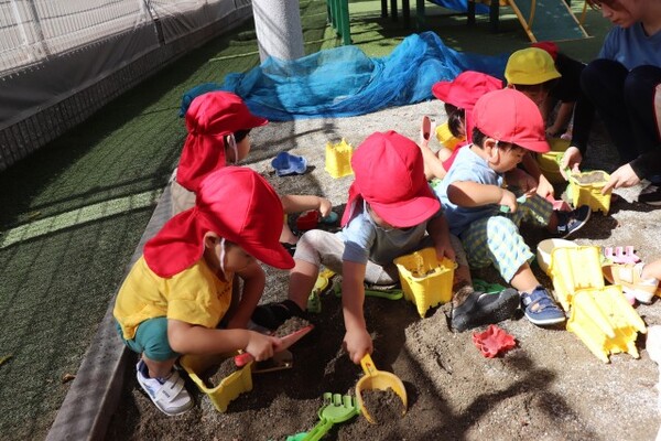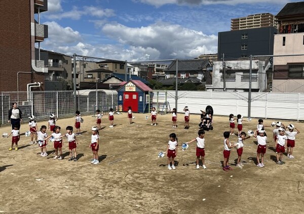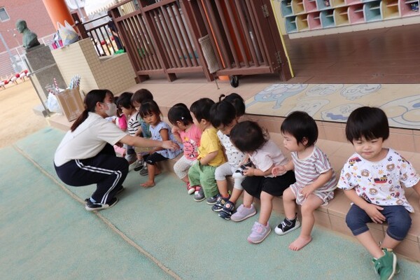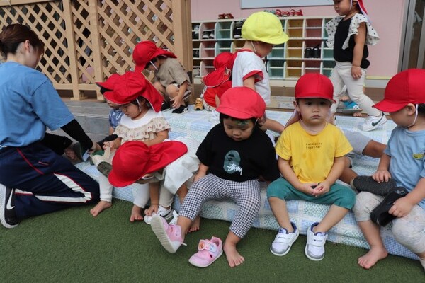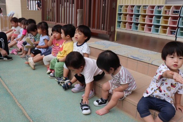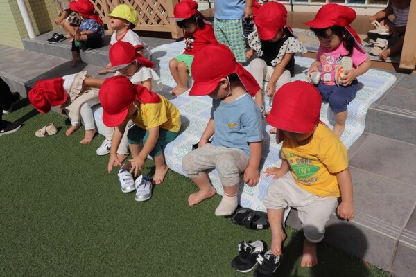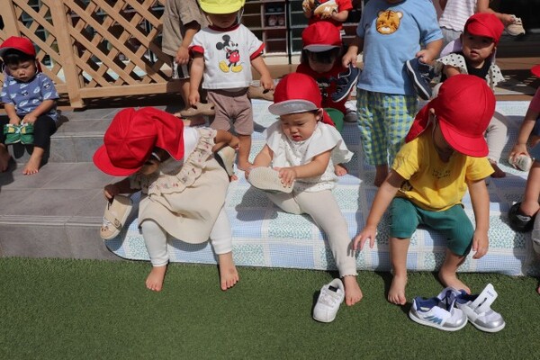 | 本園の1歳児さくら組の様子をお伝えさせていただきます。 少しずつ涼しくなり、本格的に運動会の練習も始まりました。 戸外での活動が多くなると、子どもたちも自分で靴を履くことが多くなり・・・最近、靴を履こうと必死に頑張っています! 足を持ち上げたり、力を込めて靴を引っ張ってみたりと、自分たちで工夫しながら取り組んでいます。 時々、左右が反対で履いてしまったりやお友だちの靴を履こうとしたり・・・子どもたちの一生懸命な姿に成長を嬉しく感じる担任です!  |
