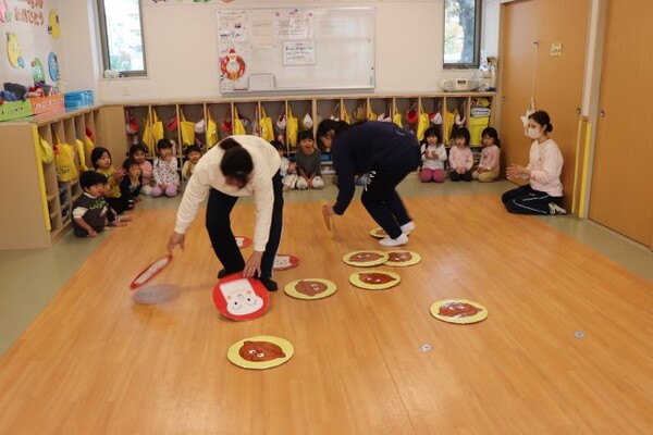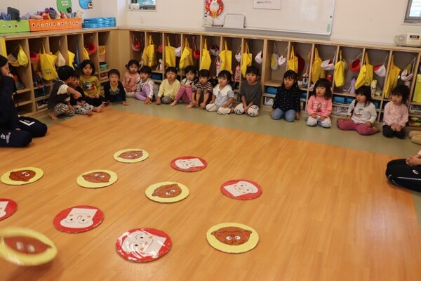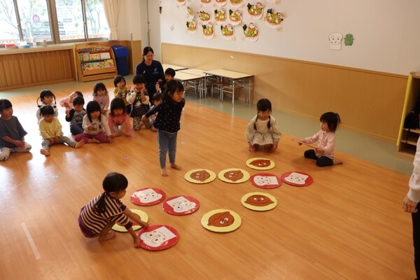 | 分園の2歳児きりん組の様子をお伝えさせていただきます。 カレーパンマンとしょくぱんまんチームに分かれて、自分のチームのカードの絵を増やしていくゲームをしました。カレーパンマンチームなのに、カードをめくってしょくぱんまんにしてしまったり、めくっていいものか…と立ち止まって考えたりする姿が見られました。競争心が芽生えてきた子どもたち。ルールを覚えて、早くめくる楽しさを感じて盛り上がりました。これから、少しずつチームの人数を増やして、レベルアップしていきたいと思います。 |