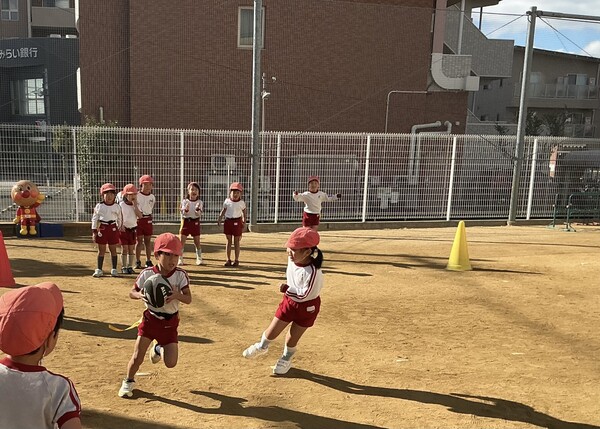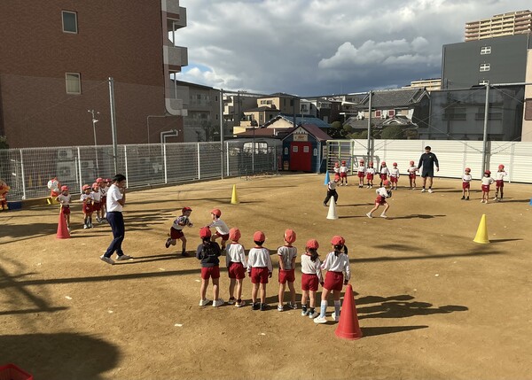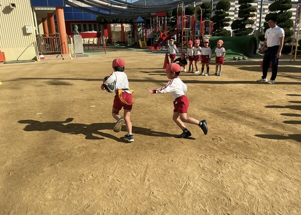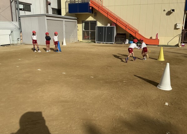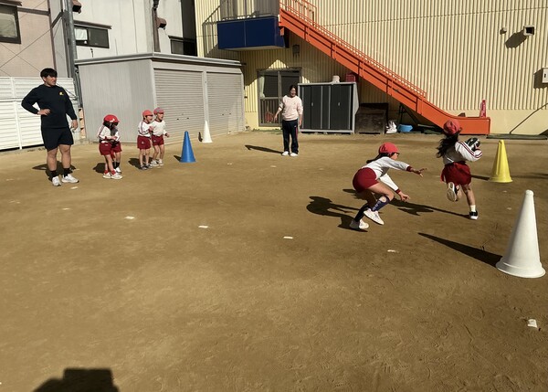 本園の5歳児ゆり組の様子をお伝えさせていただきます。 子どもたちは、ただ走るだけではなく「どう動けばトライできるか?」と考えながら、何度も“トライ!”する姿が見られました。 相手の動きをよく見てタイミングを見極めるなど、自分で考えながら動く様子がとても印象的でした。 最後にはパスの練習にも取り組みました。 声を掛け合ってタイミングを合わせたり、相手に届くように力加減を調整したりと仲間と協力する姿がたくさん見られました。 ラグビーならではの“かけ引きの面白さ”や、トライした時の喜びを味わうことができたようです。 |