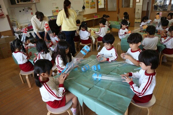 | 本園の4歳児ばら組の様子をお伝えさせていただきます。 今日は、傘袋を使ってロケットを作りました。ロケットに好きな絵を描きましたが、宇宙人を描く子や虹やお花などで可愛く仕上げる子などオリジナルロケットが完成しました。 飛ばしてみると、うまく飛ぶ子やなかなか飛ばすことが出来ない子も・・・練習を重ねるうちに遠くに飛ぶようになり、嬉しそうな子どもたちでした。 最後は、チームごとに勝負!勝った子は大喜び!負けた子は、悔しくて・・・でも、みんな楽しんでくれていました。 |