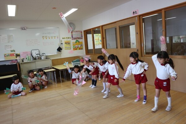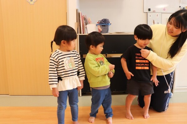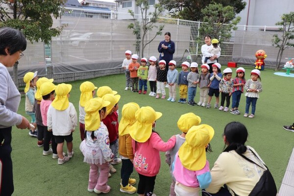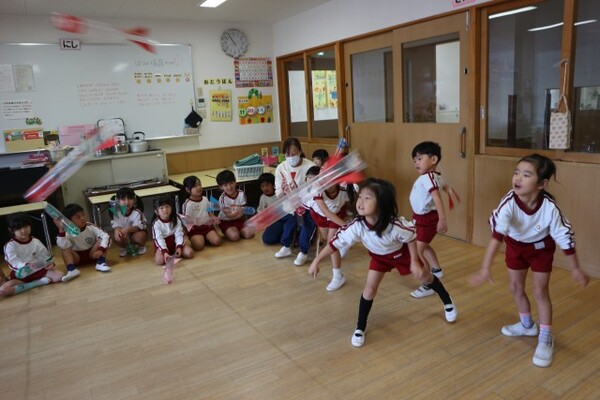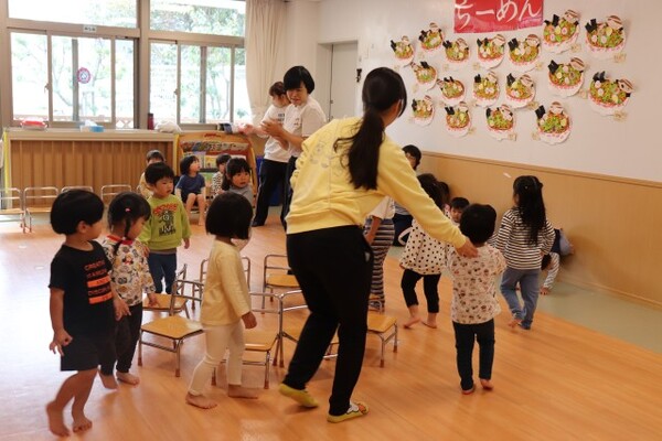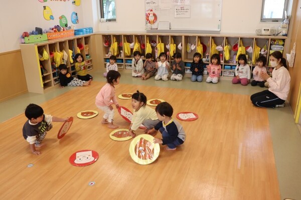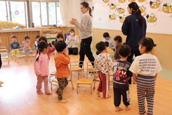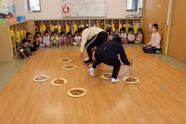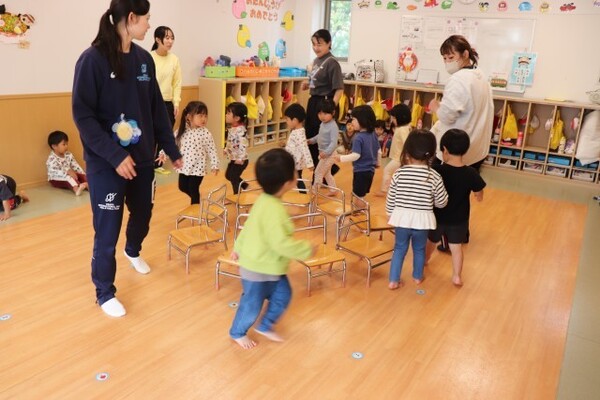 | 本園の2歳児たんぽぽ組と分園の2歳児きりん組の交流会の様子をお伝えさせていただきます。 今日は2歳児交流会ということで、たんぽぽ組ときりん組で椅子取りゲームを行いました。始めは、緊張して椅子に座るのを遠慮する子もいましたが、慣れてくると負けずに椅子に座ろうとしていましたよ。2チームに分かれて2回戦ずつ行い、クラスに関係なくみんなで応援する姿に成長を感じました。 途中から先生たちも参加し、大盛り上がりの交流会となりました。 その後は、園庭で一緒に遊んだり、お話したり・・・楽しい時間を過ごしました。 また、一緒に遊びたいと思います。 |