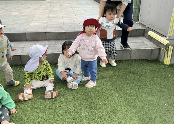 | 分園の0歳児うさぎ組の様子をお伝えさせていただきます。 今日は、園庭で遊びました。遊具や、フラフープ、鉄棒などで遊びました。少しずつ歩けるようになり、自由に動き回ったり、ドキンちゃんの遊具に乗ったり、ベンチに座ったり、それぞれ自由に遊びました。園庭遊びが大好きな、うさぎ組の子どもたち。寒さに負けず、お外でも楽しく過ごしていきたいと思います。 園庭あそびの様子は、公式インスタグラムのストーリーズで公開しております。→公式インスタグラム |