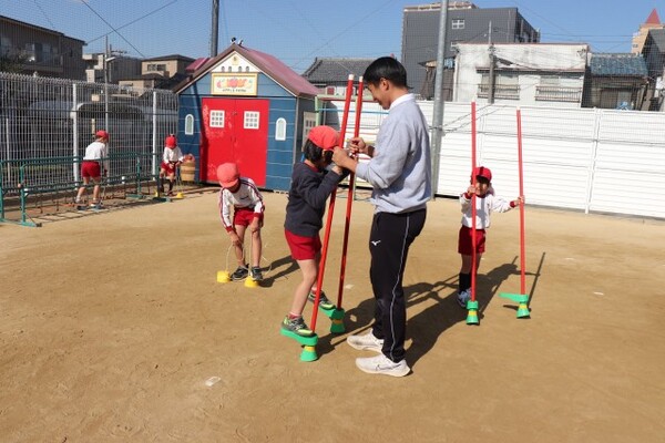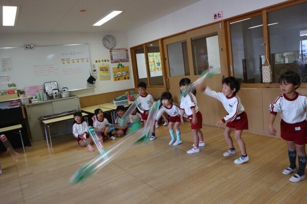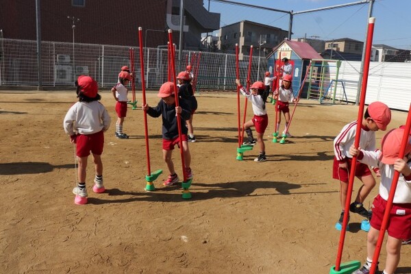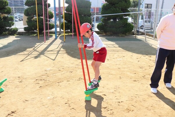 | 本園の5歳児ゆり組の様子をお伝えさせていただきます。 今日は、竹馬遊びをしました。最初は、「こんなん簡単に乗れるわ!」と言っていた子どもたち。いざ、乗ってみるとなかなか難しかったようで、「あれ〜!難しいやん!」と大騒ぎ! 想像していたのと違っていたようで、何度も何度もチャレンジし、1歩か2歩進める子も・・・また、チャレンジしたいと思います。 |