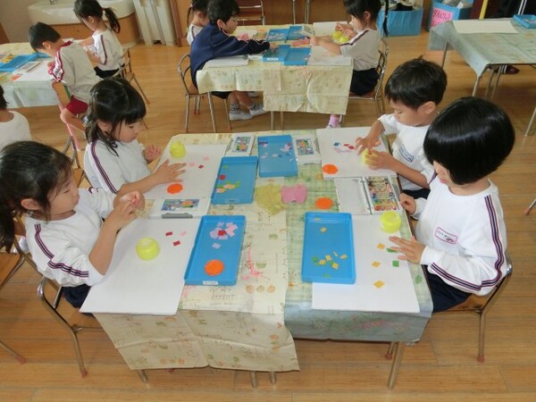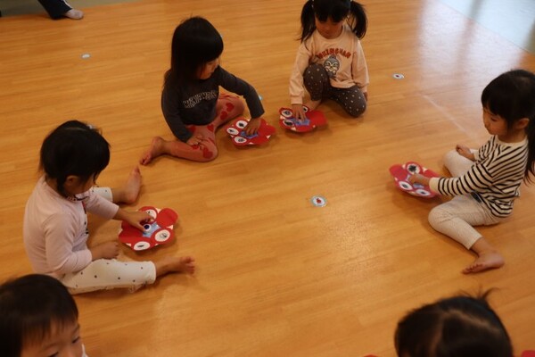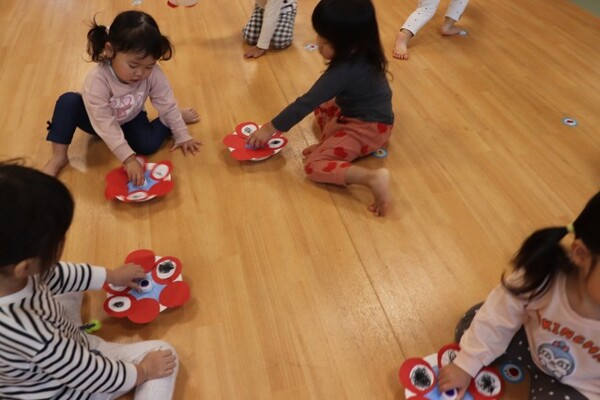 | 分園の2歳児きりん組の様子をお伝えさせていただきます。 今日は、先週から来ている実習生と一緒にミャクミャクのこまを作りました。 ミャクミャクの目を描き、のりで貼って出来上がり!実習生から、こまの回し方の説明を興味深そうに聞き、こまが回ると「うわ〜!」と嬉しそうな声が聞こえてきました。指先を使って、上手に回して楽しく遊びました。 本日持ち帰りますので、お家でもぜひ遊んでみて下さいね! |