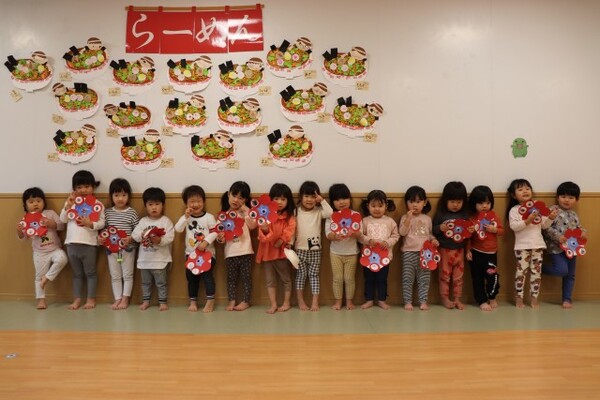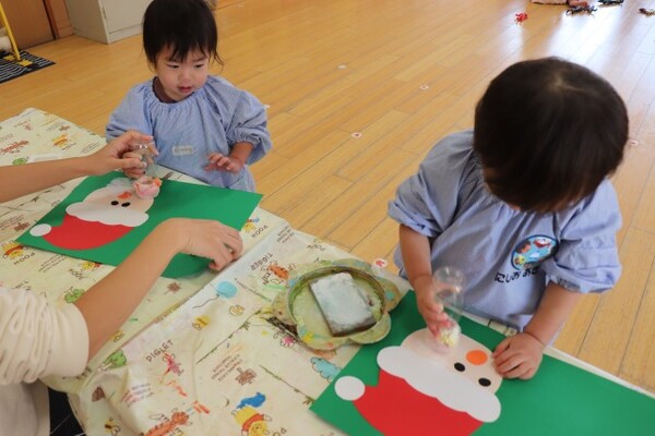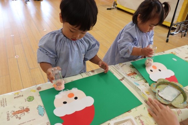 | 本園の1歳児さくら組の様子をお伝えさせていただきます。 今日は、もも組さんと一緒にプレイルームに作品展を観に行きました。壁一面の作品に「うゎ〜!」と大興奮!自分たちの作品よりも、お兄ちゃんたちの作品が気になっていた子どもたちでした。 お部屋に戻ってからは、クリスマス製作でサンタさんの”おヒゲ”をタンポで描きました。丁寧に力強く押す子、ポンポンッとダイナミックに押す子など様々でしたが、かわいいサンタさんの完成にニコニコ笑顔の子どもたちでした。 |