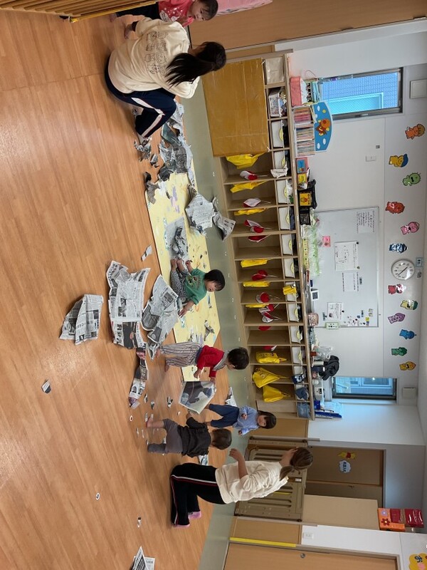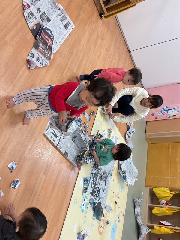 | 分園の0歳児うさぎ組の様子をお伝えさせていただきます。 今日は、新聞紙遊びをしました。久しぶりの新聞紙遊びに興味津々!くしゃくしゃに丸めたり、破ったり、穴をあけて顔をのぞかせたり、丁寧に何度もゴミ箱に捨ててくれたり・・・みんな思いおもいにたくさん遊んでいましたよ。 新聞紙遊びの様子は、公式インスタグラムのストーリーズで公開しております。→公式インスタグラム |